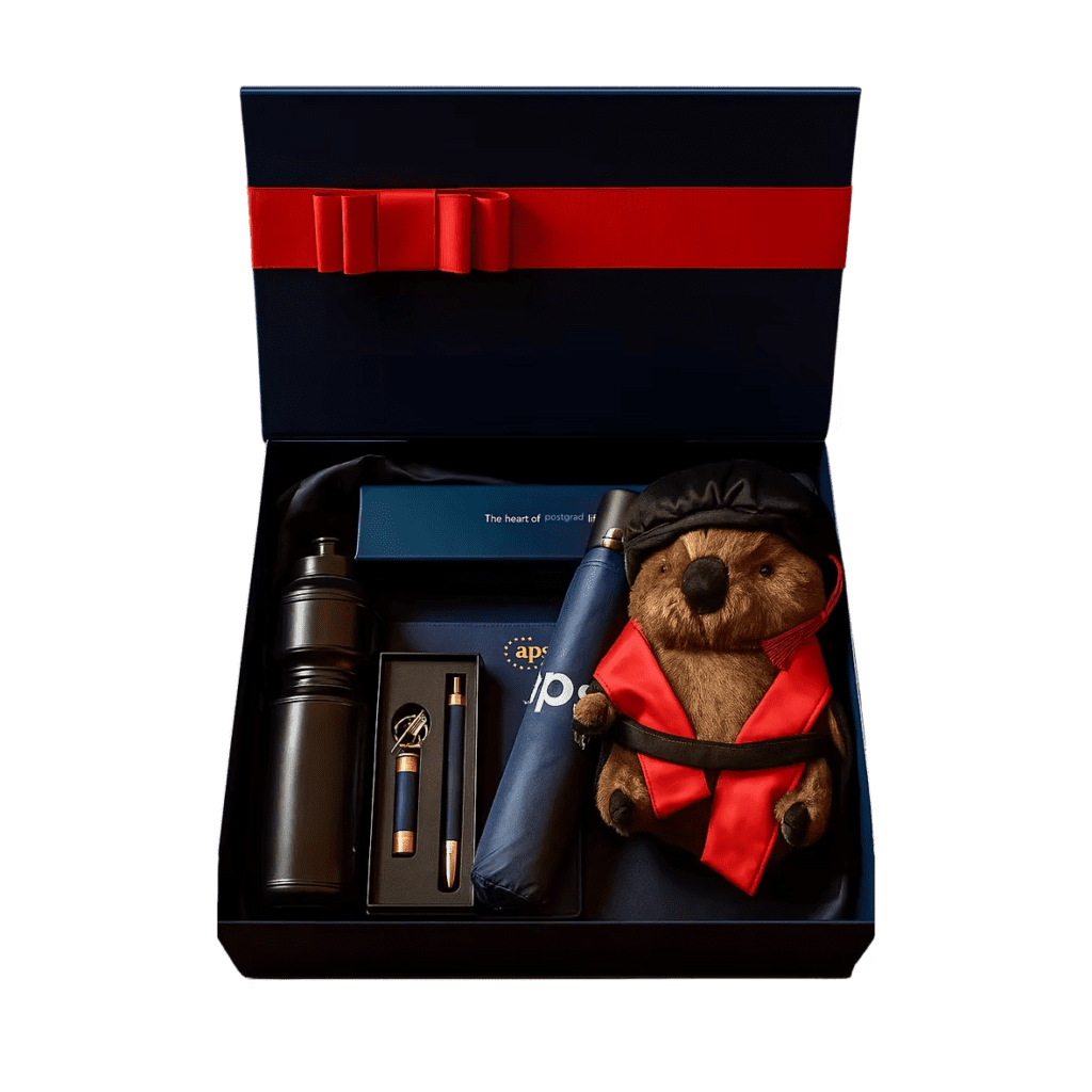 Graduation Hamper is a celebration in a box featuring your choice of a cheeky PhD Grad Wombat plushie, a sleek umbrella for stormy days ahead, a stylish pen gift set, a smart notebook for your next big idea, and more, all presented in a premium magnetic gift box with a bow.