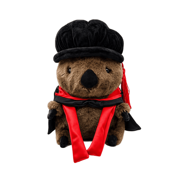 Celebrate your academic achievements with our Graduation Wombat! This adorable plush toy is the perfect gift for PhD students who are graduating. It features a red graduation hood along with a matching graduation cap, making it a great memento of your special day. Not only is it cute, but it can also hold your testamur, making it a functional keepsake that you can proudly display.